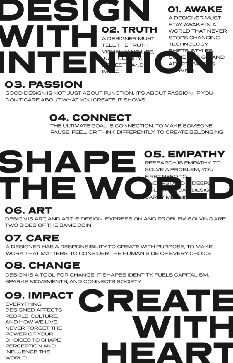 This project explores my personal design philosophy through a typographic manifesto that declares my values, responsibilities, and beliefs about the role of graphic design.